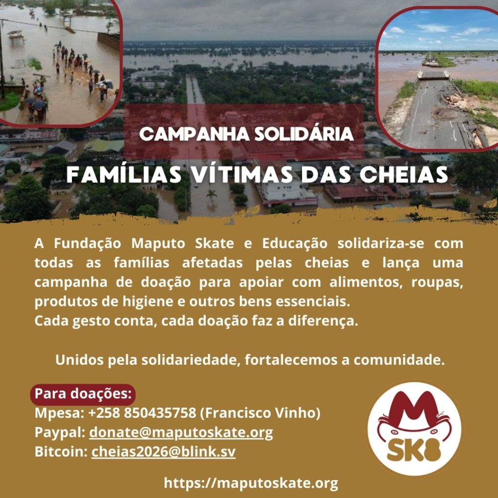 A Fundação Maputo Skate e Educação vem, por meio deste comunicado, manifestar a sua profunda solidariedade para com todas as famílias afetadas pelas cheias provocadas pelas intensas chuvas que se fazem sentir desde o início do ano de 2026 na zona sul de Moçambique.